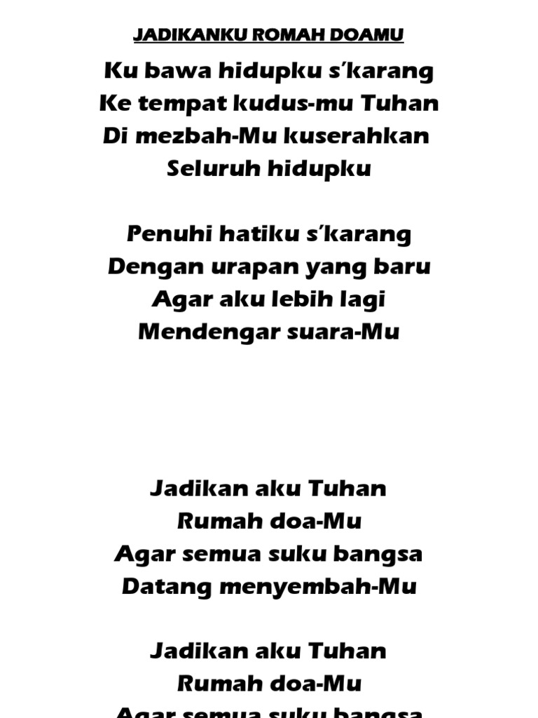 Biasanya lagu-lagu seperti ini dinyanyikan pada saat acara tertentu di gereja di rumah atau di tempat lainnya. Bawalah aku di dalam doamu Semoga sentiasa diberkati setiap waktu Tuluslah hatiku Di dalam melengkapimu Semua yang kau perlu. Di dalam harapmu kau sebut namaku.